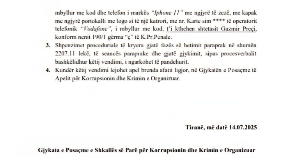 Sipas njoftimit zyrtar të Gjykatës së Posaçme (GJKKO), trupi gjykues i përbërë nga gjyqtaret Etleva Deda, Irena Gjoka dhe Flojera Davidhi, në vendimin e sotëm, më 14 korrik vendosi: