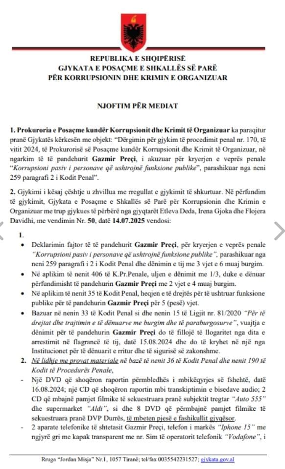 Gjykata e Posaçme kundër Korrupsionit dhe Krimit të Organizuar ka shpallur këtë të hënë vendimin për ish-shefin e Seksionit të Antidrogës në Drejtorinë Vendore të Policisë Durrës, Gazmir Preçi, duke e dënuar përfundimisht me 2 vite e 4 muaj burgim dhe pezullimin nga funksionet publike për një periudhë 5-vjeçare.