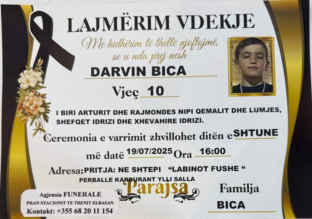 Një atmosferë zie dhe dhembjeje mbuloi pasditen e së shtunës fshatin Labinot-Fushë të Elbasanit, ku familjarë dhe banorë i dhanë lamtumirën e fundit dy vëllezërve të mitur, Darvin dhe Francesk Bica, të moshës 10 dhe 8 vjeç. Dy fëmijët humbën jetën tragjikisht një ditë më parë, pasi u mbytën në rrjedhën e lumit Shkumbin.